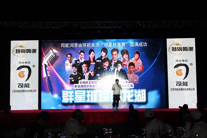 ? ? ? ?2014年12月15日晚,柳州臥龍湖高爾夫俱樂部隆重舉辦開業(yè)周年慶典暨會員“明星慈善邀請賽”,孫楠、王寶強、朱時茂等十幾位明星齊聚柳州臥龍湖。高爾夫賽事、慈善晚宴、文藝匯演,司能潤滑油作為協(xié)辦單位傾情傾力,與群星共同呈現(xiàn)了一場璀璨搖曳的視聽饕餮盛宴。