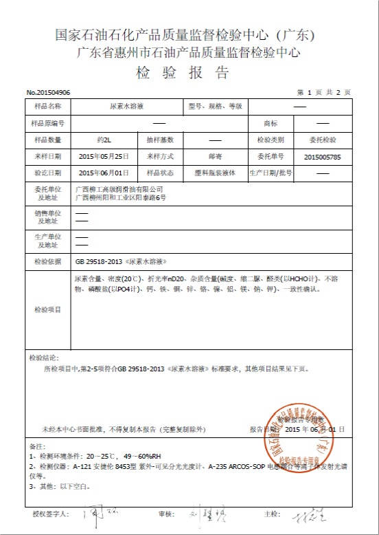 ? ? ? ? 2015年6月1日,我司的“馭藍柴油尾氣處理液”通過了第三方——國家石油石化產品質量監(jiān)督檢驗中心(廣東省惠州市石油產品質量監(jiān)督檢驗中心)的檢測,其中多個檢測項目包括:密度、折光度、堿度、縮二脲含量、醛類指標、不溶物含量、磷酸鹽含量,檢測出來的指標都遠遠低于國家規(guī)定標準,其他的重金屬鋁、鈣、鉀、鈉、銅、鐵、鎂、鎳、鋅、鉻都均未檢測出來,就連紅外定性也與標準譜圖一致,相關技術指標均符合國家GB 29518-2013《尿素水溶液》的嚴格標準,最后“馭藍”順利地拿到了合格的檢測報告。