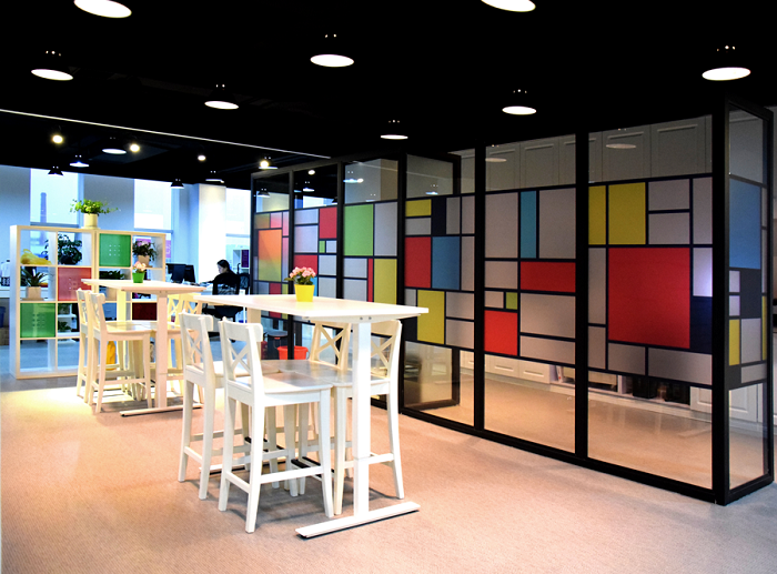 ? ? ? ?工業(yè)氣息濃郁的黑色墻頂,簡潔干凈的白色墻面及柔和的灰色地面,構(gòu)成了寬敞現(xiàn)代的空間,繽紛的果凍色彩軟裝點(diǎn)綴,更符合上海的都市氣息。