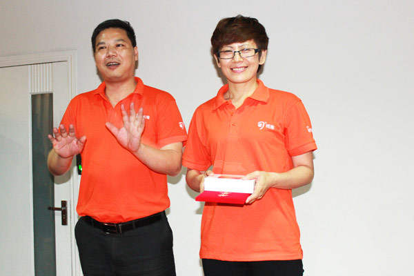 △總經(jīng)理助理李紹英為大客戶經(jīng)理張劍鋒頒發(fā)最佳進(jìn)步獎(jiǎng)。